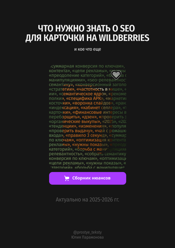 Юлия Парамонова — профессиональный копирайтер. В теме seo-копирайтинга для Wildberies — с 2021 года. Помню все вехи изменений алгоритмов. Держу руку на пульсе и сейчас. Пишу seo на заказ. Клиенты приходят по сарафану и по инерции. О том, как все работает, веду ТГ-канал @prostye_teksty.